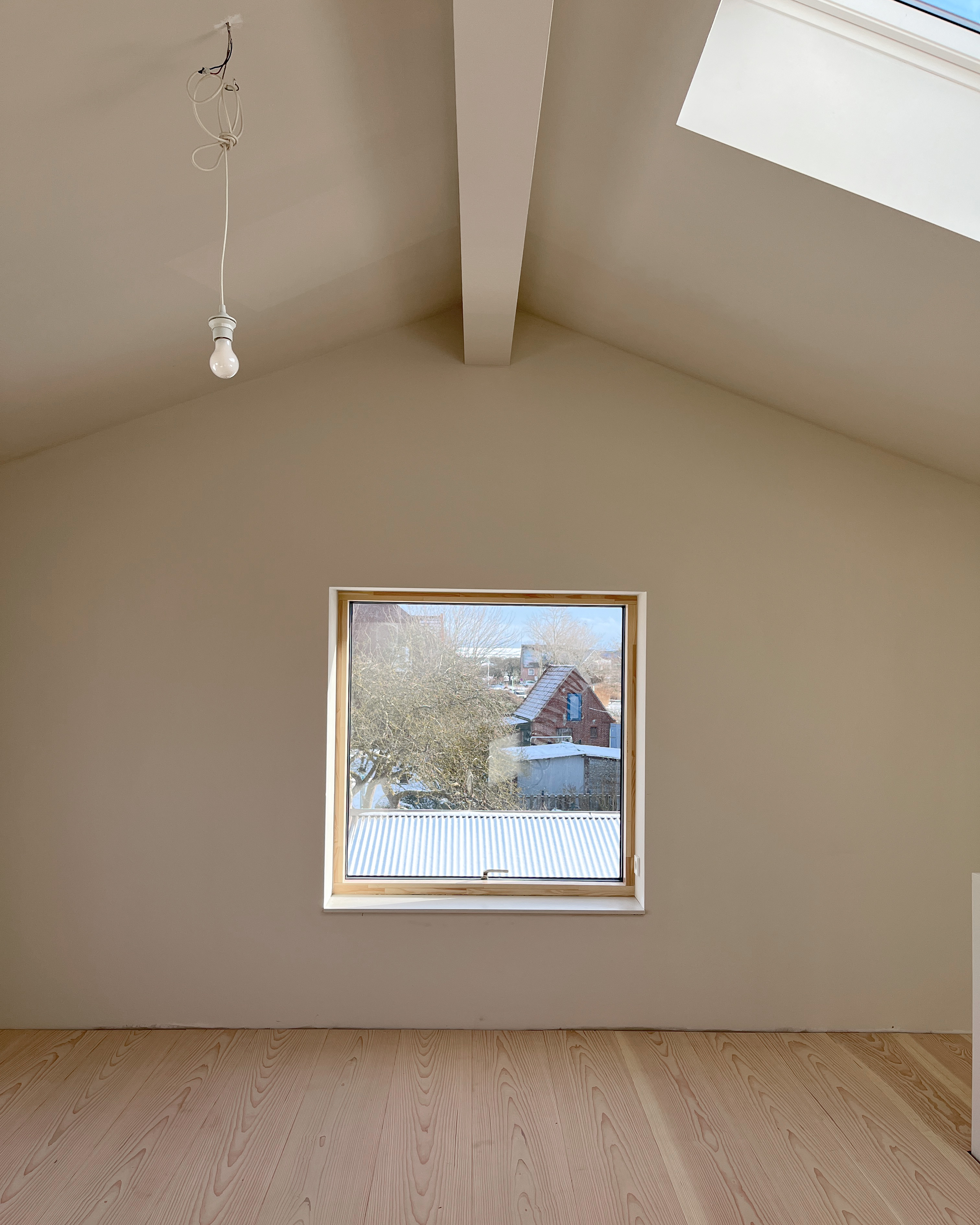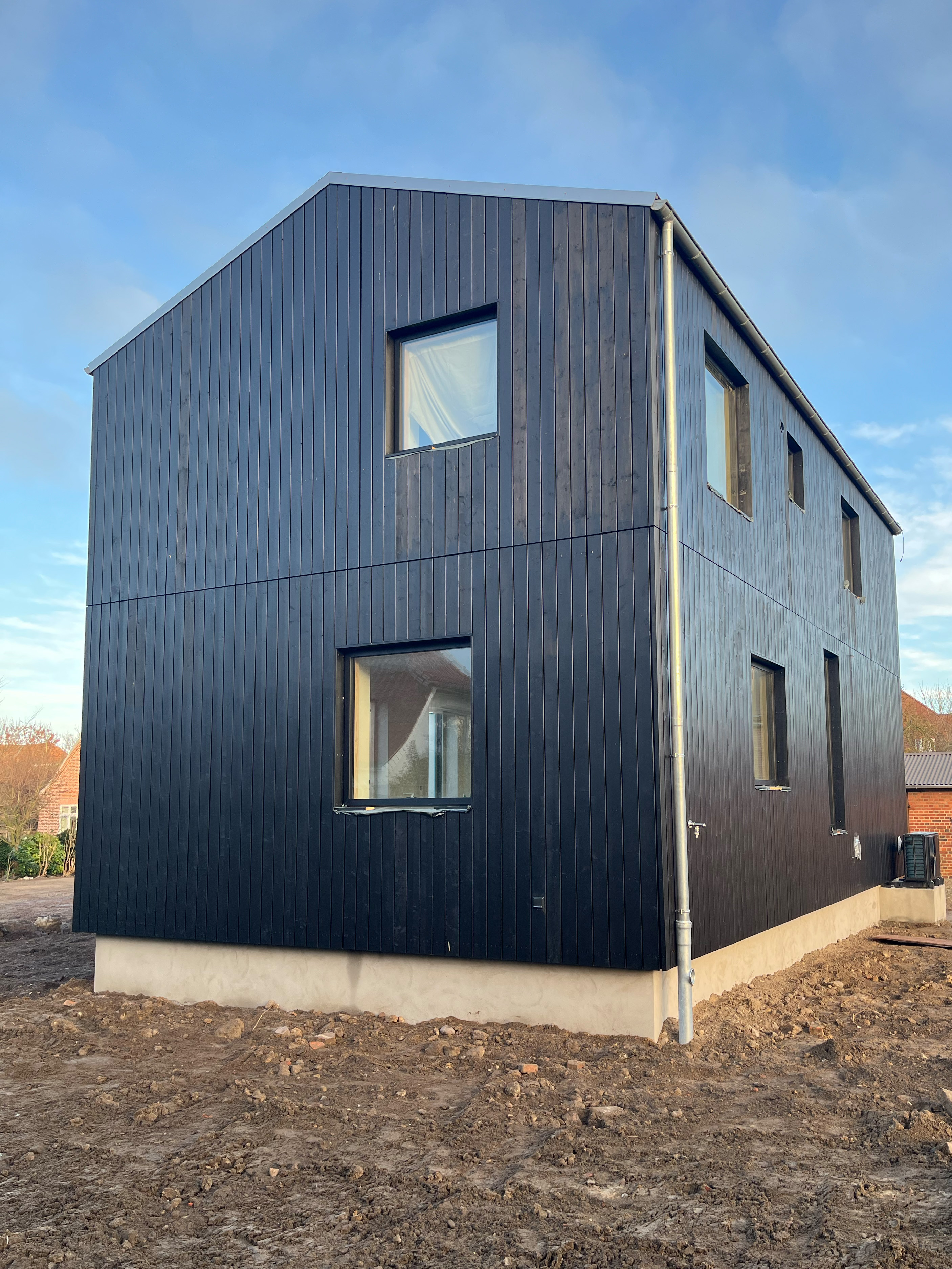 Der Holzbau erinnert mit seiner ortstypisch flachen Dachneigung an die alte Scheune, das sich zuvor auf dem Grundstück befand. Seine dunkle Holzfassade betont die klare Kubatur. Auf einer geringen Grundfläche haben wir einen kompakten Grundriss entwickelt, der gleichzeitig ein großzügiges Raumgefühl entstehen lässt. Eine gut durchdachte Raumaufteilung berücksichtigt nach außen die Privatsphäre der Bewohnenden und maximiert den verfügbaren Raum fließend durch eine luftige Gestaltung bis unters Dach. Durch seine Holzrahmenbauweise mit regionalem Holz und einem Dach aus Zinkwellblech, ist das Gebäude einfach und kosteneffizient gebaut. Massivholzdielen und Kalkfarbe erzeugen im Inneren ein gesundes Wohnklima und eine behagliche Atmosphäre.