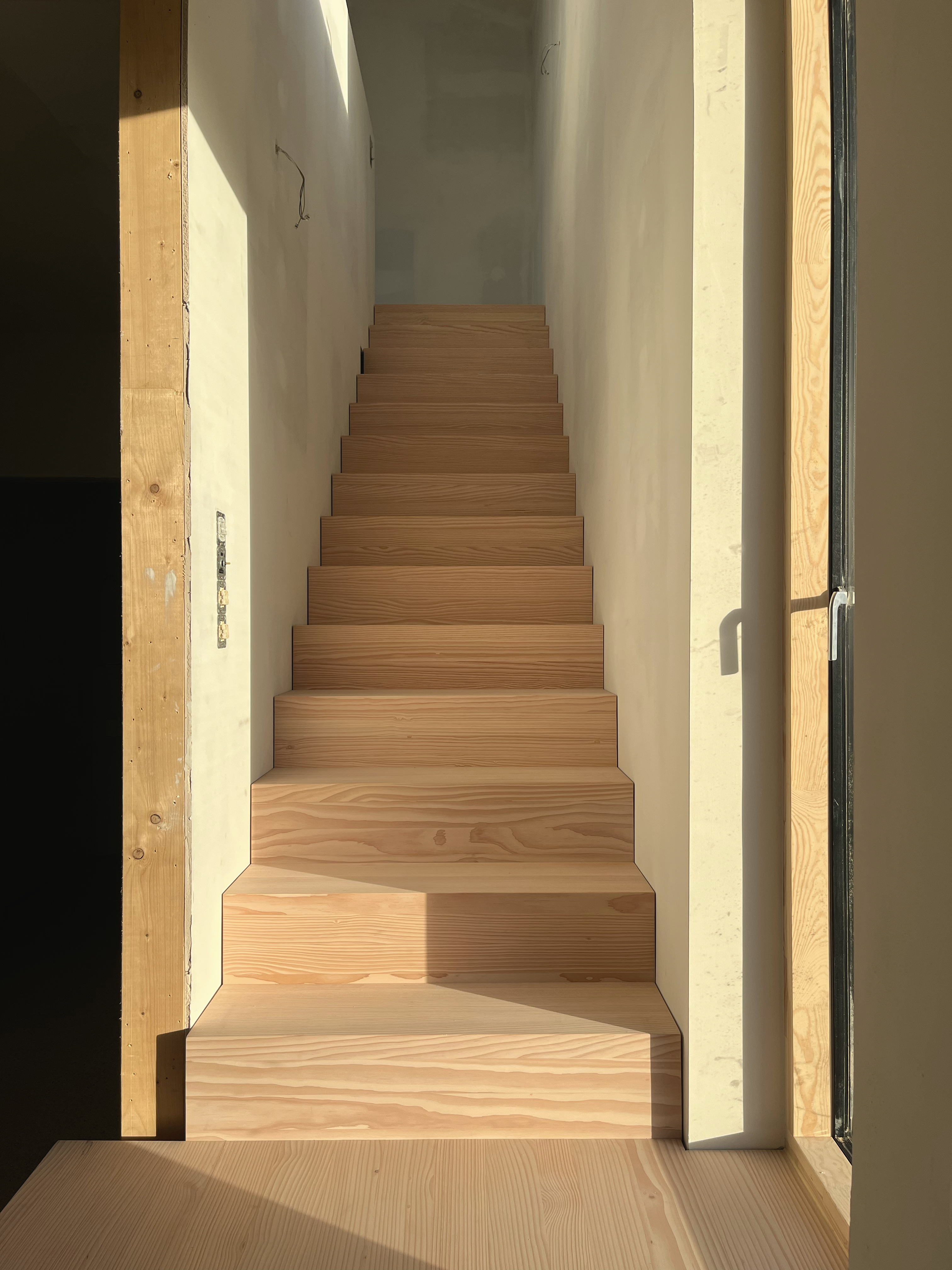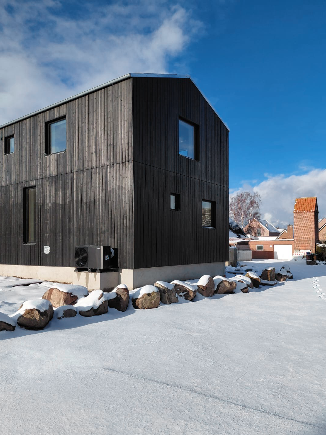 Der Holzbau erinnert mit seiner ortstypisch flachen Dachneigung an die alte Scheune, das sich zuvor auf dem Grundstück befand. Seine dunkle Holzfassade betont die klare Kubatur. Auf einer geringen Grundfläche haben wir einen kompakten Grundriss entwickelt, der gleichzeitig ein großzügiges Raumgefühl entstehen lässt. Eine gut durchdachte Raumaufteilung berücksichtigt nach außen die Privatsphäre der Bewohnenden und maximiert den verfügbaren Raum fließend durch eine luftige Gestaltung bis unters Dach. Durch seine Holzrahmenbauweise mit regionalem Holz und einem Dach aus Zinkwellblech, ist das Gebäude einfach und kosteneffizient gebaut. Massivholzdielen und Kalkfarbe erzeugen im Inneren ein gesundes Wohnklima und eine behagliche Atmosphäre.